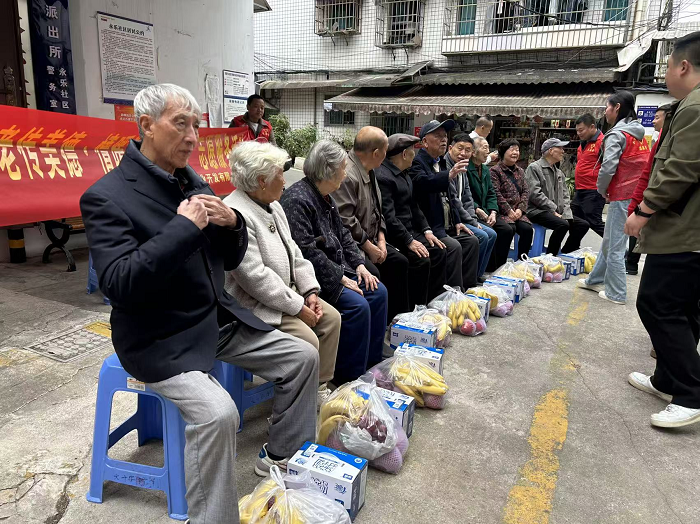 【圖為志愿者給老人們發(fā)放慰問(wèn)品】